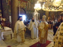 Εκεί τον υποδέχθηκε ο Εφημέριος της Ενορίας Πρεσβύτερος Ιωάννης Μπαραμπούτης και ο Σεβασμιώτατος χοροστάτησε στον Όρθρο και στη συνέχεια προεξήρχε στη Θεία Λειτουργία.
