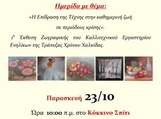 Η Τράπεζα Χρόνου Χαλκίδας διοργανώνει ημερίδα με θέμα: «Η επίδραση της τέχνης στην καθημερινή ζωή σε περιόδους κρίσης» και παράλληλα την 1η έκθεση ζωγραφικής του Καλλιτεχνικού Εργαστηρίου Ενηλίκων.