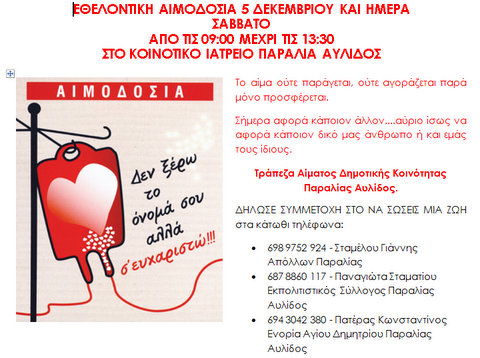 Η εθελοντική αιμοδοσία θα γίνει το Σάββατο 5 Δεκεμβρίου, από τις 9 το πρωί μέχρι την 1 το μεσημέρι, στο Κοινοτικό Ιατρείο της Παραλίας Αυλίδας.