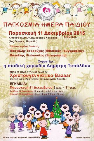 Μετά το τέλος της εκδήλωσης, στις 8 το βράδυ, θα γίνουν τα εγκαίνια Χριστουγεννιάτικου μπαζάρ, στην αίθουσα "Αριστοτέλης", στο ισόγειο του Δημαρχείου. Το μπαζάρ θα διαρκέσει μέχρι την Κυριακή 13 Δεκεμβρίου.