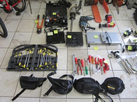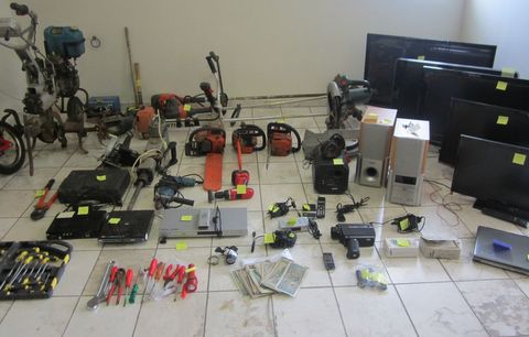 Πλήθος ηλεκτρικών και μηχανοκίνητων εργαλείων, διάφορες ηλεκτρονικές συσκευές (τηλεοράσεις, φορητός Η/Υ, συσκευές αναπαραγωγής ψηφιακών δίσκων, εκτυπωτής φωτογραφιών κ.α.), διαρρηκτικά εργαλεία (κόφτης, κατσαβίδια, τανάλια κ.α.), δύο αυτοσχέδια ξύλινα ρόπαλα, ένα παιδικό ποδήλατο και διάφορα άλλα αντικείμενα.