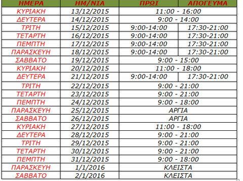 Το ωράριο θα ισχύσει από τις 13 Δεκεμβρίου μέχρι τις 2 Ιανουαρίου. Το Σάββατο 2 Ιανουαρίου 2016, τα καταστήματα θα παραμείνουν κλειστά λόγω της Κυριακάτικης λειτουργίας τους στις 20 και στις 27 Δεκεμβρίου.