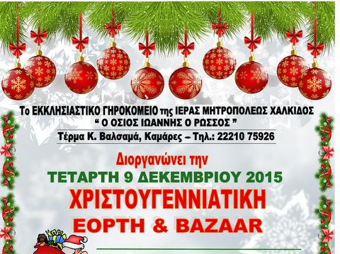 Χριστουγεννιάτικη γιορτή και μπαζάρ θα πραγματοποιηθεί την Τετάρτη 9 Δεκεμβρίου, στις 6 το απόγευμα, στο χώρο του Εκκλησιαστικού Γηροκομείου Χαλκίδας (Τέρμα οδού Βαλσαμά, στις Καμάρες).