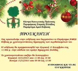Χριστουγεννιάτικο Μπαζάρ διοργανώνει το Κέντρο Κοινωνικής Πρόνοιας (Παράρτημα ΑΜΕΑ Εύβοιας), στο πρώην Δημαρχείο Αυλίδας, την Κυριακή 12 και την Δευτέρα 13 Δεκεμβρίου.