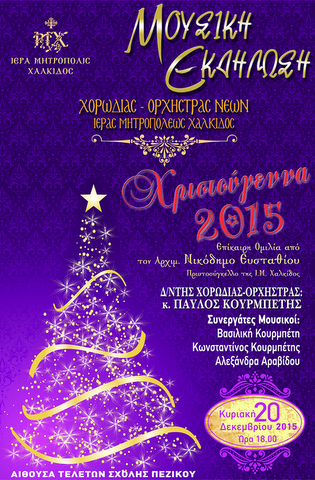 Ενόψει της γιορτής των Χριστουγέννων, την Κυριακή 20 Δεκεμβρίου, στις 6 το απόγευμα, στην Αίθουσα Τελετών της Σχολής Πεζικού Χαλκίδας, θα πραγματοποιηθεί η καθιερωμένη Χριστουγεννιάτικη Εκδήλωση της Χορωδίας - Ορχήστρας των Νέων της Ιερής Μητρόπολης Χαλκίδας.