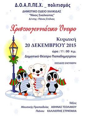 Μουσική εκδήλωση με τίτλο «Χριστουγεννιάτικο Όνειρο», θα πραγματοποιηθεί, την Κυριακή 20 Δεκεμβρίου, στις 11 το πρωί, στο Δημοτικό Θέατρο Παπαδημητρίου, από τις τάξεις μουσικής προπαιδείας, της Αθηνάς Τσολάκου και πιάνου της Καλλιόπης Στρατάκια, του Δημοτικού Ωδείου Χαλκίδας «Ν. Σκαλκώτας».