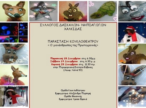 Ο Σύλλογος Δασκάλων- Νηπιαγωγών Χαλκίδας, στο πλαίσιο των Χριστουγεννιάτικων δράσεών του, διοργανώνει παράσταση κουκλοθέατρου, με τη διασκευή του βιβλίου της Ζωής Βαλάση «Ο χιονάνθρωπος της Πρωτοχρονιάς» και εμψυχώτρια την Αλεξάνδρα Πυρπιρή.