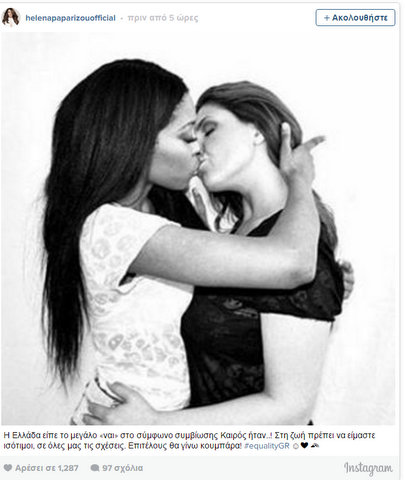 Μια φωτογραφία στην οποία φιλάει μία γυναίκα γιόρτασε την έγκριση του συμφώνου συμβίωσης, από την Βουλή των Ελλήνων, η τραγουδίστρια Έλενα Παπαρίζου, η οποία πόσταρε στο Instagram την φωτογραφία με το σχόλιο: