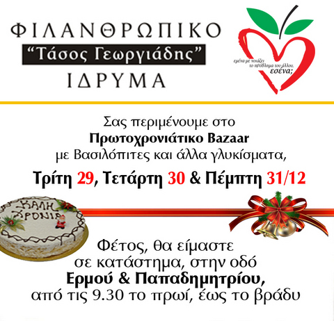 Πρωτοχρονιάτικο μπαζάρ, με βασιλόπιτες και άλλα γλυκίσματα, διοργανώνει το Ίδρυμα "Τάσος Γεωργιάδης" το τριήμερο 29, 30 και 31 Δεκεμβρίου. Φέτος το μπαζάρ θα φιλοξενηθεί σε κατάστημα, στην συμβολή των οδών Ερμού και Παπαδημητρίου, στη Χαλκίδα.