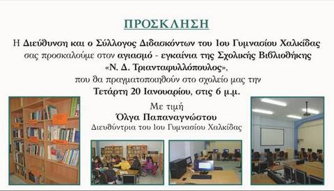 Ο αγιασμός και τα εγκαίνια της Σχολικής Βιβλιοθήκης, η οποία ονομάστηκε "Ν. Δ. Τριανταφυλλόπουλος", για να τιμηθεί ο διακεκριμένος Χαλκιδέος φιλόλογος, θα πραγματοποιηθούν την Τετάρτη 20 Ιανουαρίου, στις 6 το απόγευμα.