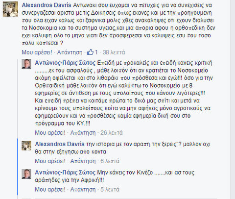 Η ανακοίνωση της υποψηφιότητας του για την εκπροσώπηση των γιατρών στο Διοικητικό Συμβούλιο του Νοσοκομείου Χαλκίδας - Κύμης - Καρύστου, από τον Αντώνη Σώτο, στην προσωπική του σελίδα στο facebook προκάλεσε έντονη αντιπαράθεση με τον συνάδελφό του Αλέξανδρο Δάβρη.