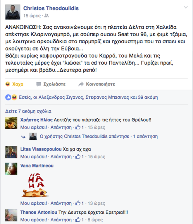Απίστευτη ανάρτηση του Χρήστου Θεοδουλίδη (φωτο) τα σπάει από το πρωί στο Facebook. Κράζει σε αυτήν έναν κλασικό κλαρινογαμπρό, που φαίνεται πως ξεσήκωσε όλη τη γειτονιά στην πλατεία Δέλτα.