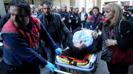 Προκλήθηκε ένταση με αστυνομικούς που δεν τους επέτρεψαν την είσοδο στο κτίριο και μεταφέρθηκε στο νοσοκομείο διαδηλώτρια, που έχασε τις αισθήσεις της (φωτο δεξιά).