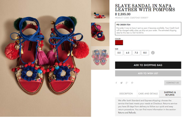 Επικριτικά είναι τα άρθρα στα μεγάλα περιοδικά μόδας για την δημιουργία των σανδάλων που τους έδωσαν την ονομασία «Σανδάλια σκλάβου», τα οποία εκτός από την απαράδεκτη ονομασία πωλούνται και στην εξωφρενική τιμή των 2.400 δολλαρίων.