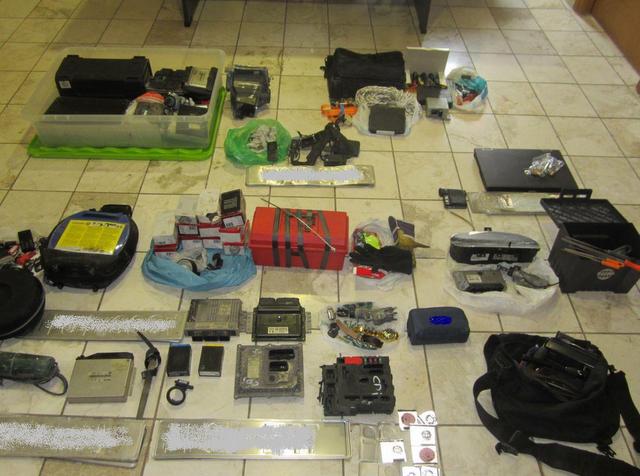 Κατασχέθηκαν κλεμμένο όχημα, πληθώρα συστημάτων κλοπής οχημάτων (ηλεκτρονικοί «εγκέφαλοι», συστήματα απενεργοποίησης immobilizerκ.λ.π.), μεγάλος αριθμός πινακίδων κυκλοφορίας, ποσότητες ηρωίνης και κάνναβης, διαρρηκτικά εργαλεία κ.α.