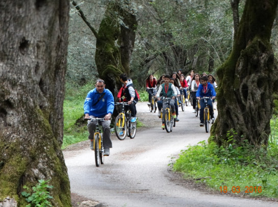 Μετά από μια σύντομη θεωρητική εισήγηση ήρθε η ώρα για ποδήλατο. Μαθητές και καθηγητές κατευθύνθηκαν με τα ποδήλατα στον αιωνόβιο ελαιώνα Λευκίμμης ακολουθώντας μια μαγευτική διαδρομή, όπου και έκαναν μελέτη πεδίου.