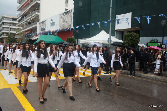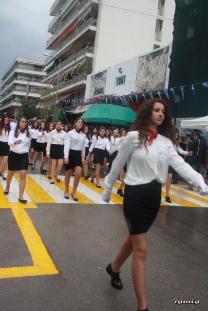 Την παράσταση στην παρέλαση των γυμνασίων έκλεψαν τα κορίτσια. Ειδικά οι μαθήτριες του 5ου Γυμνασίου ξεχώρισαν με τη φινέτσα και τον αρκετά καλό συντονισμό τους (φωτό δεξιά).