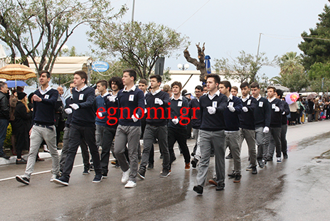 Με αγέρωχο ύφος και αρκετά καλό βήμα παρέλασαν και φέτος τα αγόρια του 1ου λυκείου Χαλκίδας. Δεν πτοήθηκαν από τη βροχή και ούτε φοβήθηκαν μην τους χαλάσει το ...hairstyle. Χαρακτηριστική είναι η περίπτωση του Τάσου Τσίγκου (πρώτος δεξιά), του οποίου η φράντζα κρατήθηκε στο ...ύψος της!