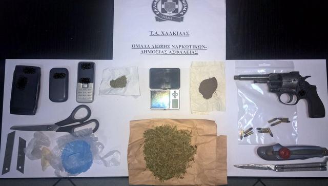 Επίσης βρέθηκαν, μία ζυγαριά ακριβείας και ένας μεταλλικός τρίφτης κάνναβης, με υπολείμματα ναρκωτικής ουσίας, ένα στιλέτο και τρία κινητά τηλέφωνα, καθώς και σύνεργα για το διαχωρισμό και τη συσκευασία των ναρκωτικών ουσιών (νάιλον συσκευασίες, ψαλίδια και διάφοροι κόπτες).