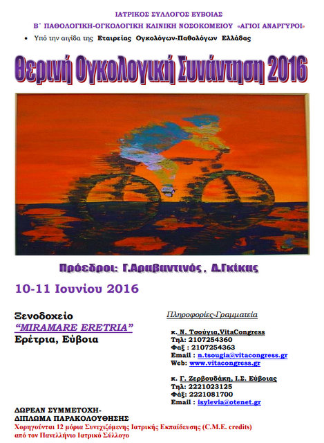 Ο Ιατρικός Σύλλογος Εύβοιας, η Β΄ Παθολογική Ογκολογική Κλινική του Νοσοκομείου «Άγιοι Ανάργυροι» και η Εταιρεία Ογκολόγων-Παθολόγων Ελλάδας, πραγματοποιούν την ετήσια ογκολογική διημερίδα τους στην Ερέτρια.
