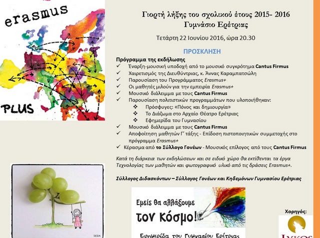 Η γιορτή λήξης του σχολικού έτους του Γυμνασίου Ερέτριας θα πραγματοποιηθεί την Τετάρτη 22 Ιουνίου, στις 8:30 το βράδυ, στο χώρο του σχολείου. Οι μαθητές θα παρουσιάσουν τις δράσεις τους στο πρόγραμμα Erasmus+ και τα προγράμματα που υλοποίησαν.