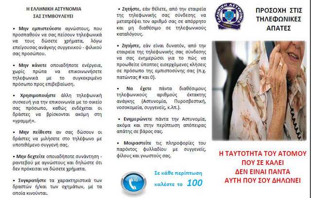 Η Ελληνική Αστυνομία, στο πλαίσιο της πρόληψης και αποτροπής περιστατικών εξαπάτησης, από επιτήδειους που προσεγγίζουν κυρίως άτομα τρίτης ηλικίας με σκοπό την καταβολή χρημάτων, αναπτύσσει ενημερωτικές δράσεις και διανέμει έντυπο πληροφοριακό υλικό με χρήσιμες συμβουλές, σε πολίτες σε όλη τη χώρα.