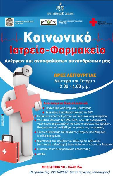 Να υπενθυμίσουμε ότι το κοινωνικό φαρμακείο-ιατρείο λειτουργεί στο κτήριο Πνευματικού (οδός Μεσσαπίων 10, Χαλκίδα). Πληροφορίες στο τηλ. 2221600887, κατά τις ώρες λειτουργίας.