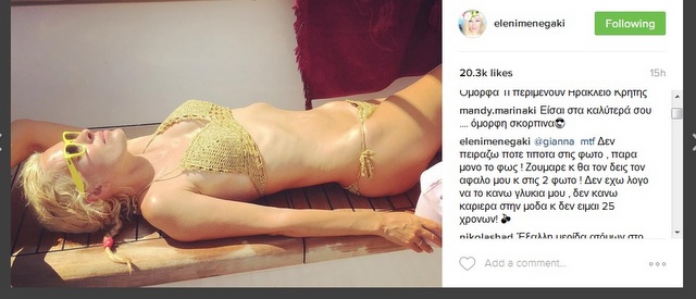 Η Ελένη Μενεγάκη απάντησε ξανά μέσω Instagram, γράφοντας: «Δεν πειράζω ποτέ τίποτα στις φώτο, παρά μόνο το φως! Ζούμαρε και θα τον δεις τον αφαλό μου και στις δύο φωτογραφίες! Δεν έχω κανέναν λόγο να το κάνω γλυκιά μου. Δεν κάνω καριέρα στη μόδα και δεν είμαι 25 χρονών».