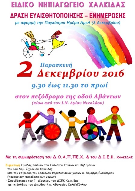 Με αφορμή την Παγκόσμια Ημέρα ΑμεΑ ( 3 Δεκέμβρη), το Ειδικό Νηπιαγωγείο Χαλκίδας θα πραγματοποιήσει δράση ευαισθητοποίησης και ενημέρωσης την Παρασκευή 2 Δεκεμβρίου, από τις 9.30 μέχρι τις 11:30 το πρωί.
