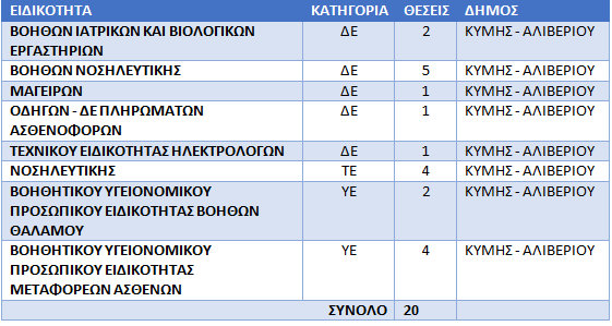 Οι θέσεις που εγκρίθηκαν για το Νοσοκομείο Κύμης είναι συνολικά 20 με τις ειδικότητες που φαίνονται στον παρακάτω πίνακα, ενώ παράλληλα όλη αυτή η δραστηριότητα θα βοηθήσει σημαντικά στο έργο και τις υπηρεσίες του Γενικού Νοσοκομείου Κύμης.