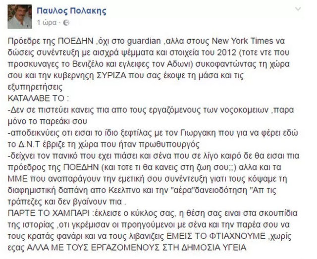 «Δεν σε πιστεύει κάνεις πια από τους εργαζόμενους των νοσοκομείων, πάρα μόνο το παρεάκι σου. Είσαι το ίδιο ξεφτίλας με τον Γιωργάκη που για να φέρει εδώ το ΔΝΤ έβριζε τη χώρα που ήταν πρωθυπουργός. Δείχνει τον πανικό που έχει πιάσει και σένα που σε λίγο καιρό δε θα είσαι πια πρόεδρος της ΠΟΕΔΗΝ».
