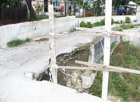 Οπως βλέπετε και στη φωτογραφία, που δημοσιεύτηκε στη "Γνώμη" ο μισός δρόμος έχει ήδη πέσει στην πλαγιά. Ο άλλος μισός είναι έτοιμος να πέσει και στο χωριό κάνουν ... δεήσεις, για να μην θρηνήσουν θύματα.