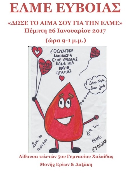 Την Πέμπτη 26 Ιανουαρίου, από τις 9 το πρωί μέχρι την 1 το μεσημέρι, θα πραγματοποιηθεί εθελοντική αιμοδοσία από την ΕΛΜΕ Εύβοιας, στην αίθουσα εκδηλώσεων του 5ου Γυμνασίου Χαλκίδας, προκειμένου να ενισχυθεί η τράπεζα αίματος της Ένωσης.