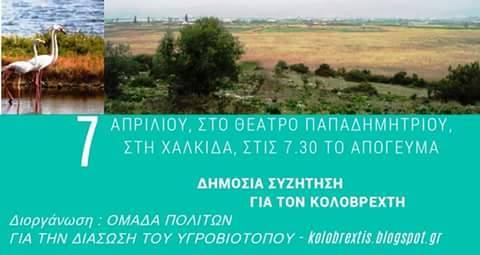Ομάδα Πολιτών, η οποία αγωνίζεται για την διάσωση του υγροβιότοπου του Κολοβρέχτη διοργανώνει δημόσια συζήτηση, την Παρασκευή 7 Απριλίου, στις 7:30 το απόγευμα, στο Θέατρο Παπαδημητρίου, στη Χαλκίδα.