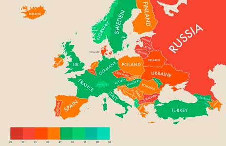Το Ισραήλ βρίσκεται στην 11η θέση, η Αυστρία στην 13η, η Ιρλανδία στην 15η, το Βέλγιο στην 17η, το Λουξεμβούργο στην 18η, η Ισπανία στην 34η, η Ιταλία στην 48η, η Κύπρος στην 65η και η Πορτογαλία στην 89η.