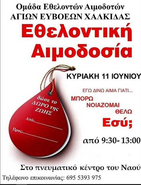 Την Κυριακή 11 Ιουνίου θα πραγματοποιηθεί Εθελοντική Αιμοδοσία από την Ομάδα Εθελοντών Αιμοδοτών της Ενορίας Αγίων Ευβοέων Χαλκίδας σε συνεργασία με το Γενικό Νοσοκομείο Χαλκίδας.
