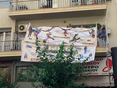 Στο ένα από αυτά υπήρχαν φιγούρες ανθρώπων που κάνουν κωλοτούμπες, ενώ αναγραφόταν και πάνω η συγκεκριμένη λέξη. Με αυτό τον τρόπο ήθελαν να περάσουν το μήνυμά τους ότι η κυβέρνηση ΣΥΡΙΖΑ κάνει κατά καιρούς δηλώσεις για την υγεία, αλλά μετά πράττει άλλα κάνοντας ...«κωλοτούμπα».