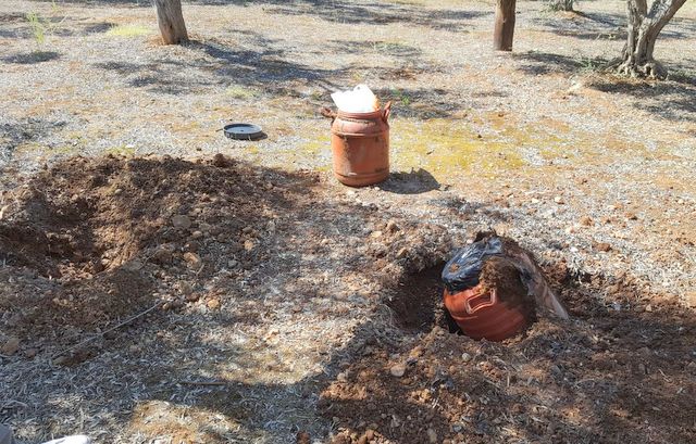Οι αστυνομικοί χρειάστηκε να σκάψουν μέσα σε χωράφι, για να βρουν τελικά τα ναρκωτικά, τα οποία είχαν τοποθετηθεί σε πλαστικά βαρέλια (στα οποία συνήθως μεταφέρεται λάδι) και είχαν θαφτεί στο έδαφος.