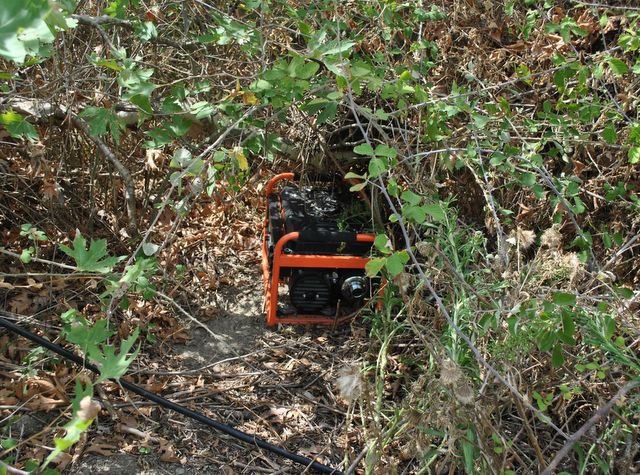 Διάφορα σύνεργα για την περιποίησή της καλλιέργειας (σκαπτικά εργαλεία, νάιλον συσκευασία με λίπασμα, ψεκαστήρας), μία βενζινοκίνητη γεννήτρια, με την οποία αντλούσαν νερό από τον ποταμό, για το πότισμα των δενδρυλλίων.