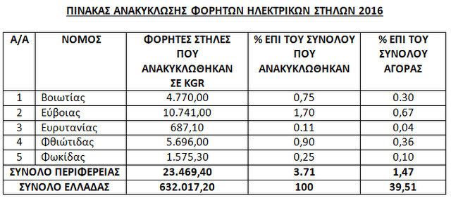 Η Εύβοιας πάντως είναι ο νομός με το μεγαλύτερο ποσοστό ανακύκλωσης επί του συνόλου αγοράς μπαταριών, με 0,67%. Δείτε παρακάτω στον πίνακα αναλυτικά τα στοιχεία για την ανακύκλωση των μπαταριών ανά νομό στη Στερεά Ελλάδα το έτος 2016.