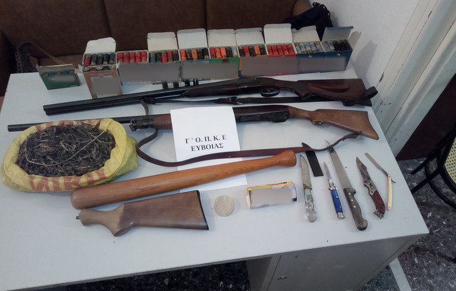 Συνολικά 231 γραμμάρια κάνναβης, δύο κυνηγετικά όπλα, 244 κυνηγετικά φυσίγγια, διαφόρων διαμετρημάτων, δύο μαχαίρια και τρία πτυσσόμενα στιλέτα, ξύλινο γκλοπ και ξύλινο κοντάκι κυνηγετικού όπλου.