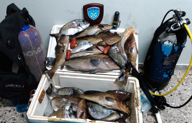 Μέσα στο σκάφος βρέθηκαν ένα ψαροντούφεκο, δύο φορητές αυτόνομες καταδυτικές συσκευές, ένας υποβρύχιος φακός, ένας ρυθμιστής αέρα, καθώς και 18 κιλά ροφών, 11 κιλά σαργών.