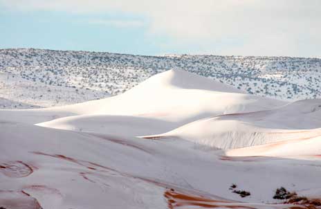 Ενα άλλο ωστόσο καιρικό φαινόμενο που σίγουρα προκαλεί όχι μόνο εντύπωση αλλά και ανησυχία είναι η χιονόπτωση στην έρημο Σαχάρα. Το καφέ χρώμα της ερήμου έγινε μέσα σε μια νύχτα άσπρο και η θερμοκρασία έπεσε αισθητά.