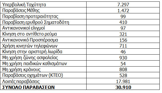 Πρωταθλήτρια στις παραβάσεις αναδείχτηκε, μακράν της δεύτερης, η υπερβολική ταχύτητα, αφού για το λόγο αυτό βεβαιώθηκαν 7297 παραβάσεις, με τις παραβάσεις μέθης να ακολουθούν σε αριθμό (1492) και τις υπόλοιπες παραβάσεις να υπολείπονται σε αριθμό.