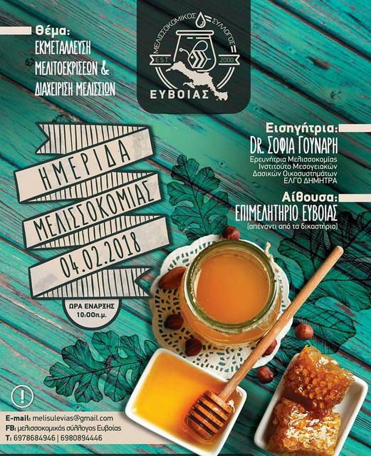 Ο Μελισσοκομικός Σύλλογος νομού Ευβοίας διοργανώνει ημερίδα για μελισσοκόμους, την Κυριακή 4 Φεβρουαρίου, στις 10 το πρωί, στην αίθουσα εκδηλώσεων του Επιμελητηρίου Εύβοιας.