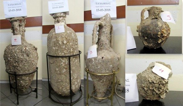 Στην οικεία του συλληφθέντα, μετά από νομότυποη έρευνα που πραγματοποιήθηκε, βρέθηκαν αρχαία αντικείμενα, και συγκεκριμένα τρεις αμφορείς (οι δύο ρωμαϊκής και ο ένας ελληνιστικής εποχής), ένας αμφορίσκος, αλλά και μία ακέραια φιάλη χωρίς λαβές ρωμαϊκής εποχής.