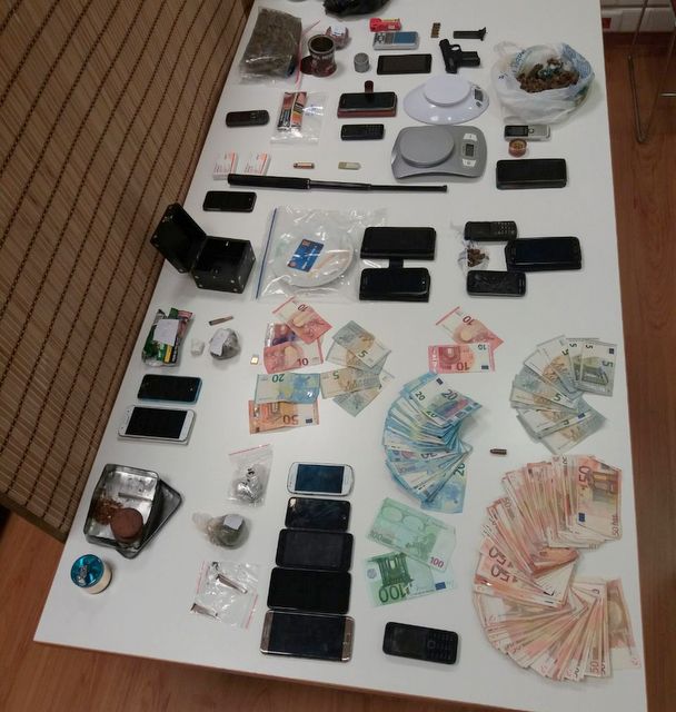 Στο πλαίσιο της συντονισμένης αστυνομικής επιχείρησης πραγματοποιήθηκαν δεκαέξι (16) κατ’ οίκον έρευνες, κατά τις οποίες βρέθηκαν συνολικά και κατασχέθηκαν 9 κιλά και 713,7 γραμμάρια ακατέργαστης κάνναβης, 506,5 γραμμάρια κοκαΐνης, 3 τσιγάρα κάνναβης, χρηματικό ποσό 8.995 ευρώ, 3 ζυγαριές ακριβείας, 1 μεταλλική πτυσσόμενη ράβδος, 20 κινητά τηλέφωνα, 1 κάλυκας από πολεμικό τυφέκιο, 1 πιστόλι κρότου με 5 φυσίγγια, 1 σπρέι πιπεριού, 6 αμπούλες, 1 ψηφιακή συσκευή αποθήκευσης ψηφιακών δεδομένων (usb stick) χωρητικότητας 8 GB.