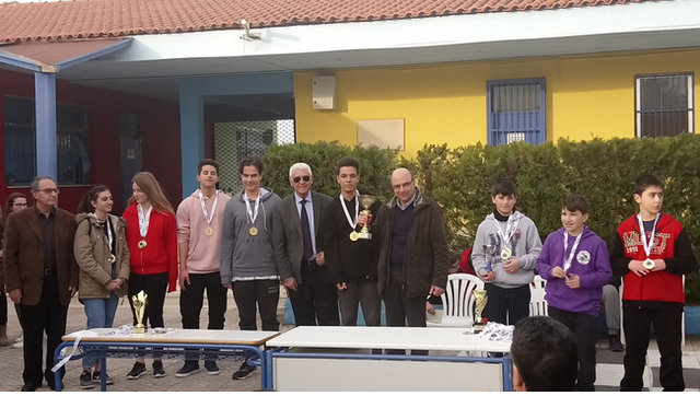 Στη φωτογραφία ο Δήμαρχος Θηβαίων Σπύρος Νικολάου παραδίδει το κύπελλο του πρωταθλήματος στον πρόεδρο της Ευβοϊκής Ένωσης Σκακιστών Παναγιώτη Γιαννούτσο.