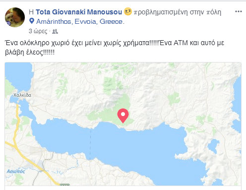 Οργή και αγανάκτηση έχει προκαλέσει στους κάτοικους της Αμαρύνθου το γεγονός ότι έχουν ξεμείνει από μετρητά, αφού το απόγευμα της Παρασκευής 30 Μαρτίου παρουσίασε βλάβη το μοναδικό ΑΤΜ που έχει παραμείνει σε λειτουργία στην παραθαλάσσια κωμόπολη.