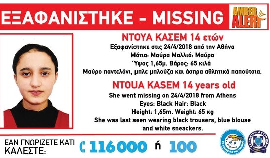 Την Τρίτη 24 Απριλίου, στις 4 το πρωί, εξαφανίστηκε από την Αθήνα η Ντουά (ον) Κασέμ (επ), 14 ετών. Η Ντουά έχει μαύρα μαλλιά, μαύρα μάτια, έχει ύψος 1,65 μ. και ζυγίζει 65 κιλά. Την ημέρα που εξαφανίστηκε φορούσε μαύρο παντελόνι, μπλε μπλούζα και άσπρα αθλητικά παπούτσια.